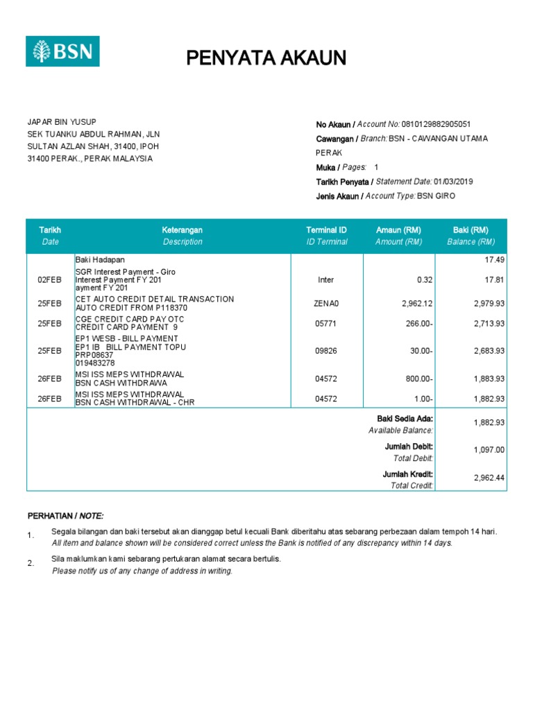 Penyata bank BSN akan memberikan laporan sejarah transaksi dalam bentuk e-penyata e. From 700am - 1200 midnight. Mybsn statement contoh penyata akaun bank bsn.